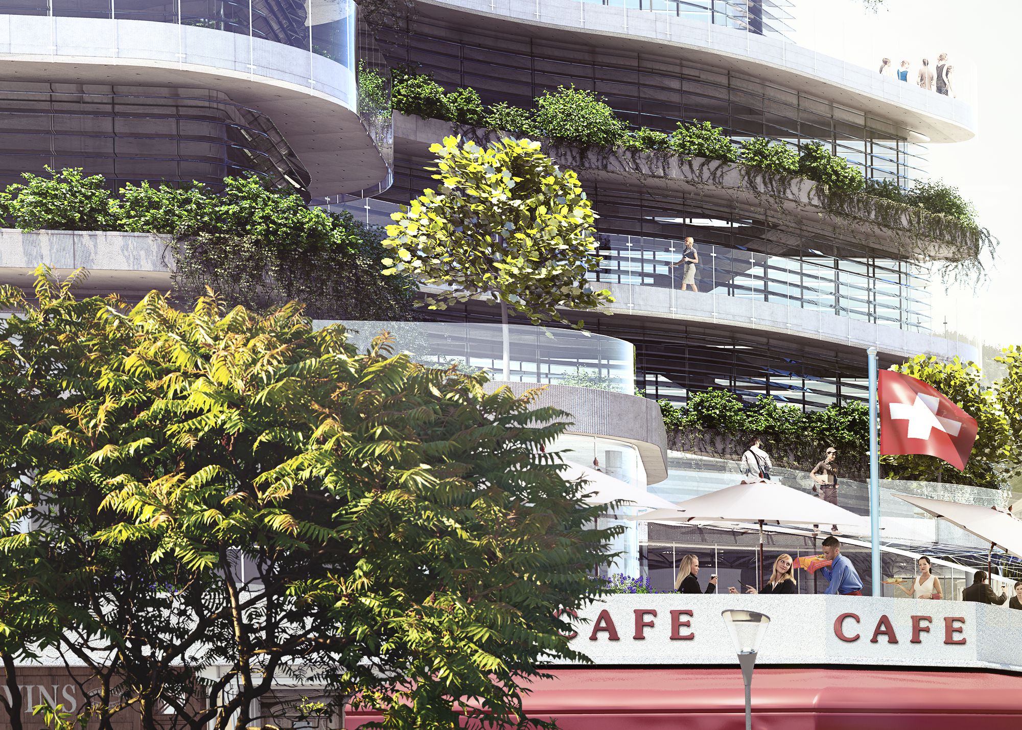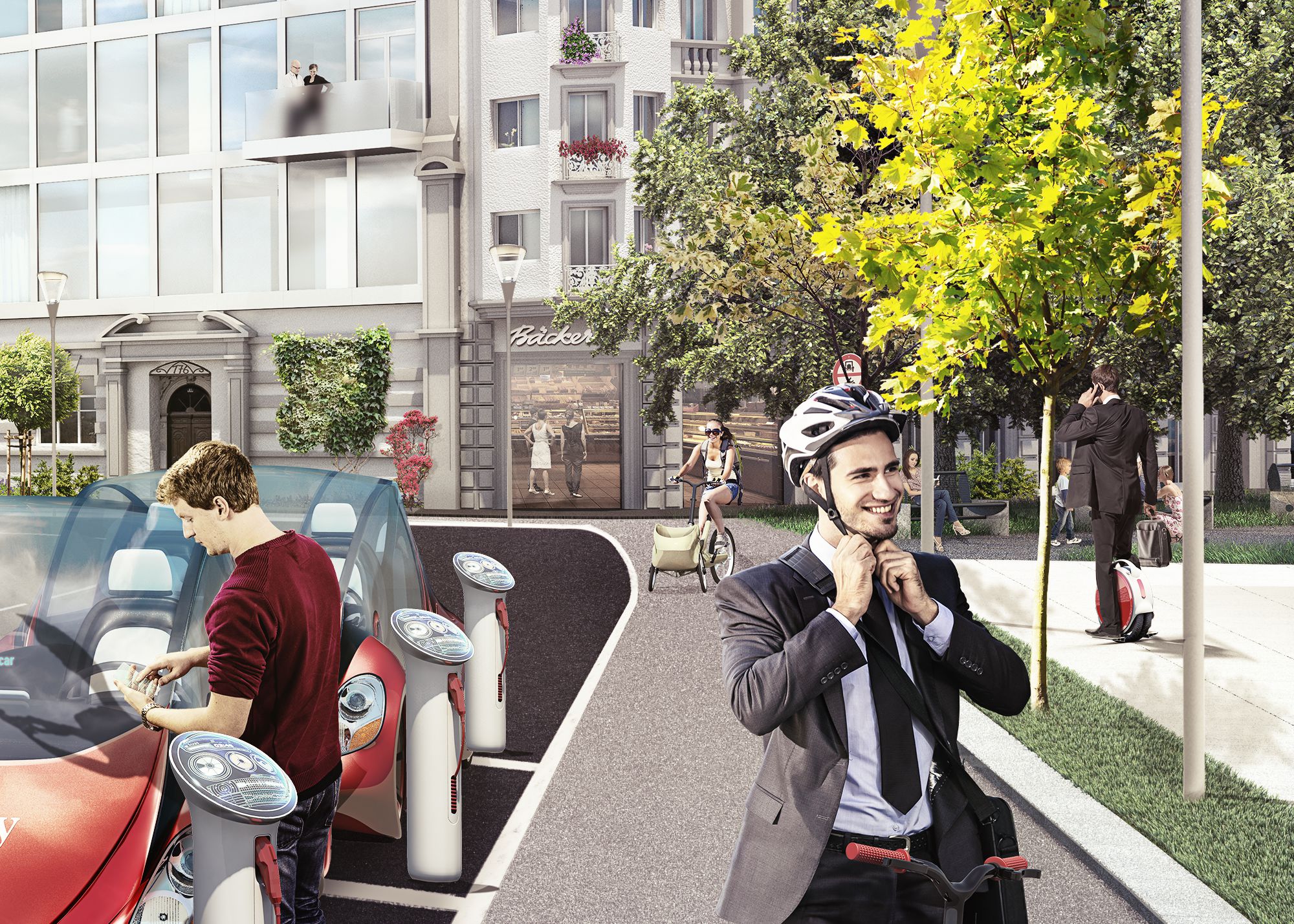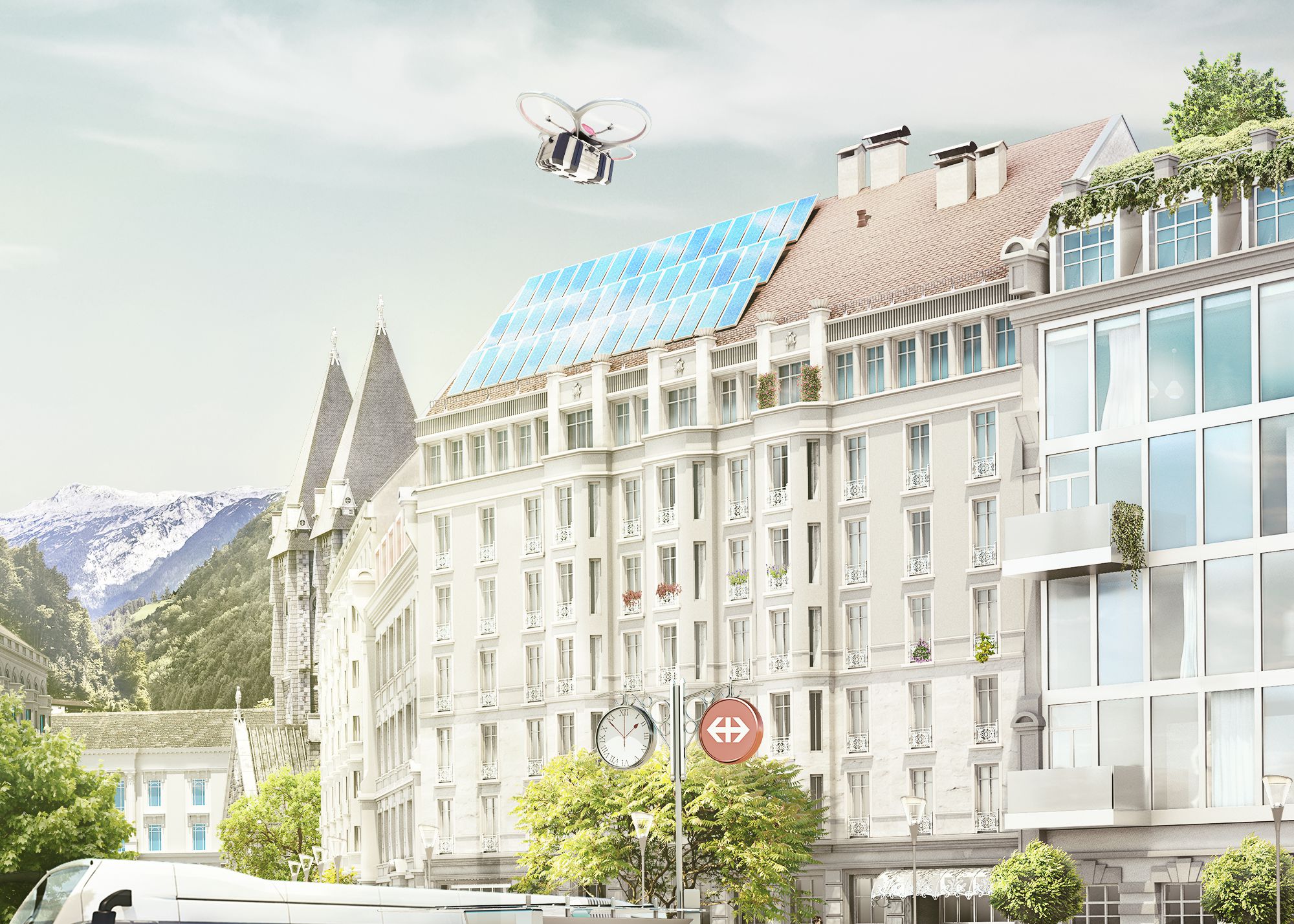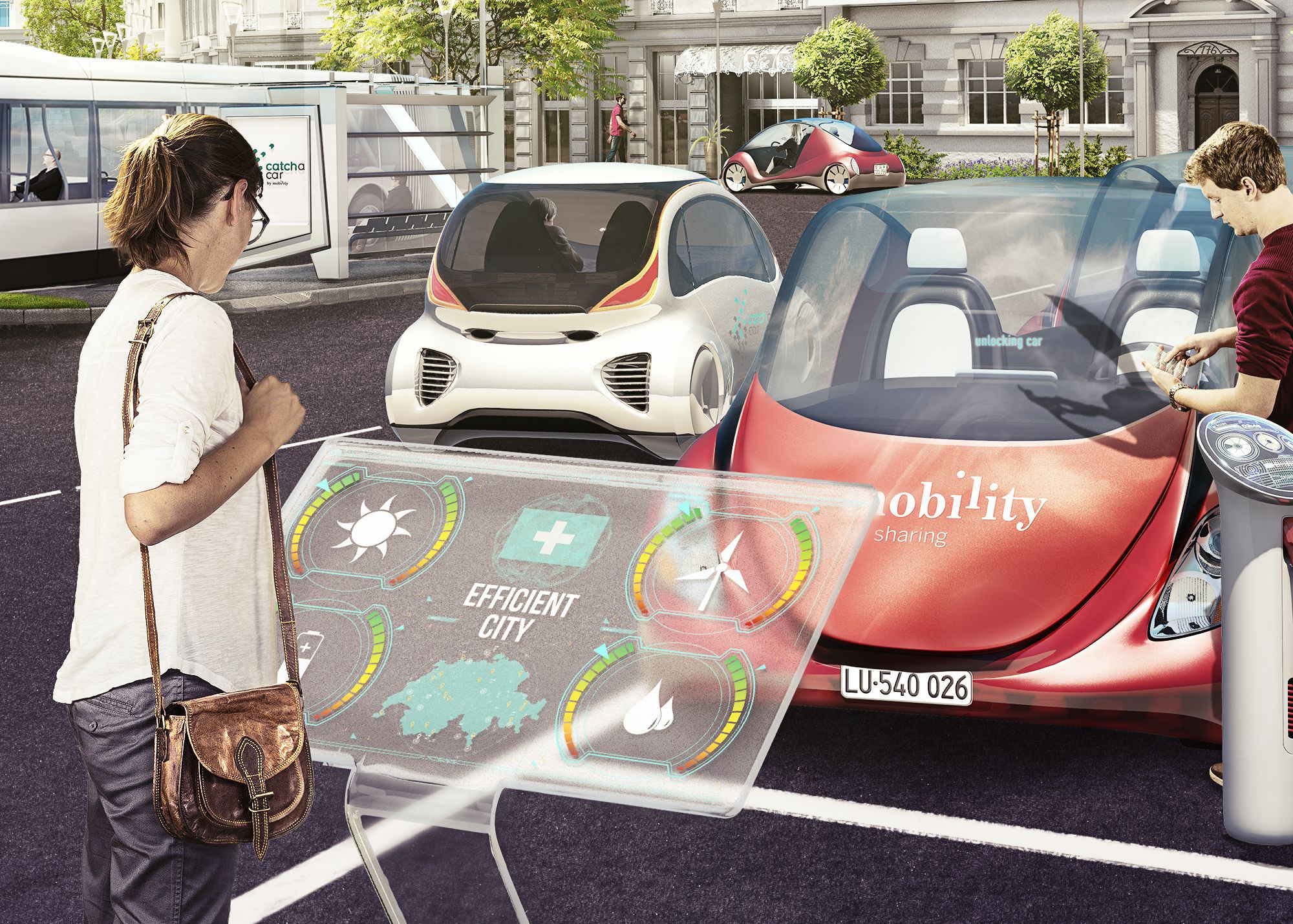 The car sharing company „Mobility Genossenschaft“ from Luzern (CH) asked us to visualize their vision of a Swiss city in 2030. We accepted this challenge and created this green city filled with lots of e-vehicles, a self-driving car, drones and happy people.