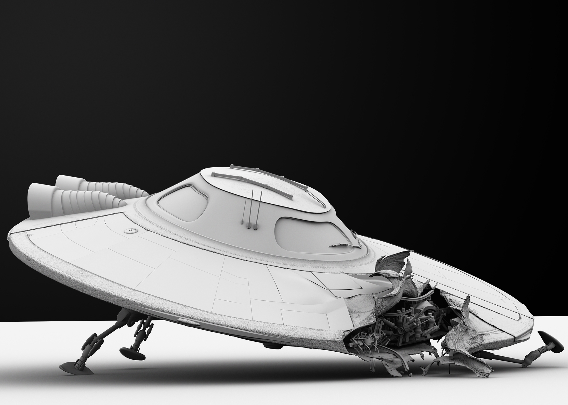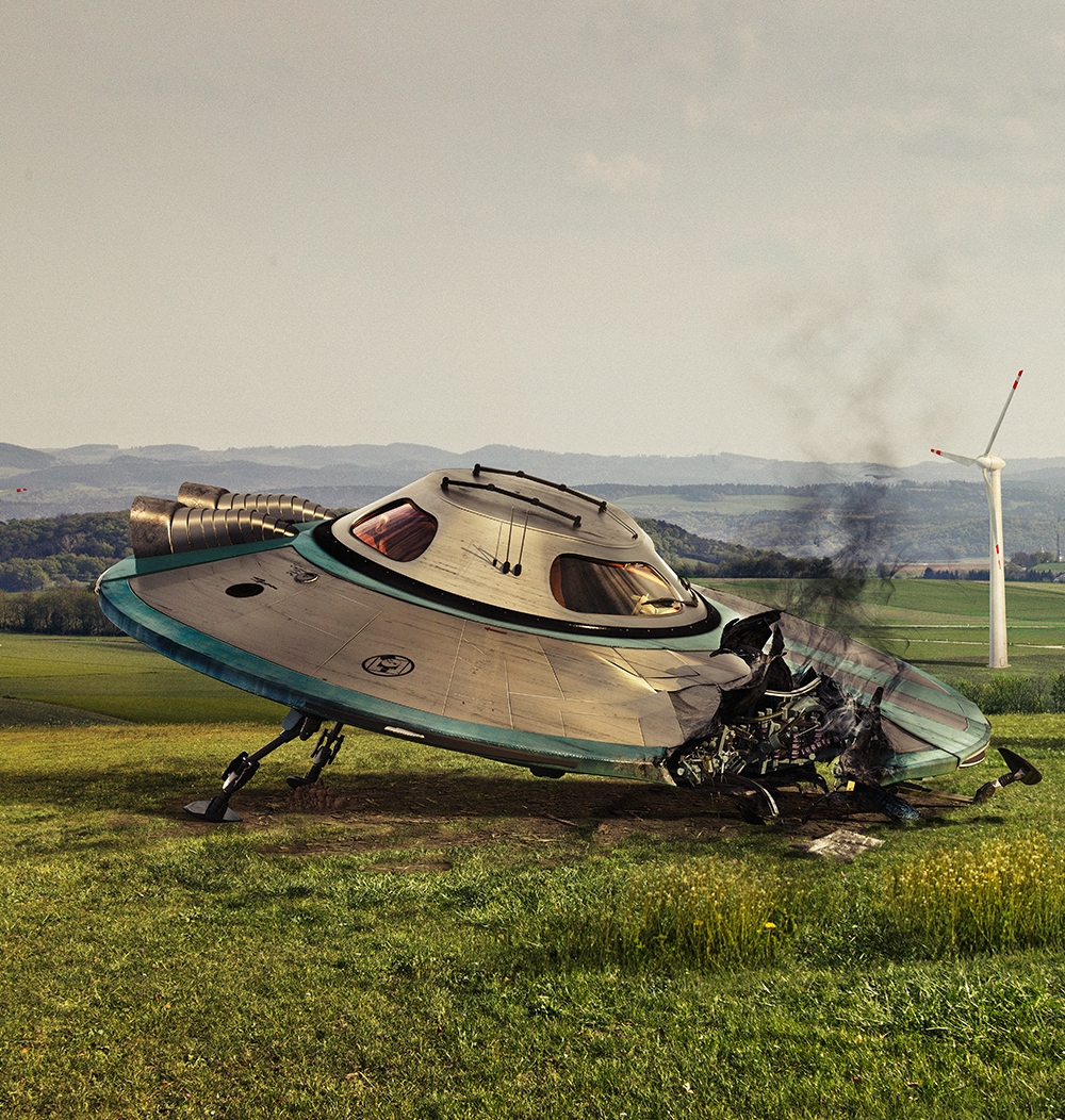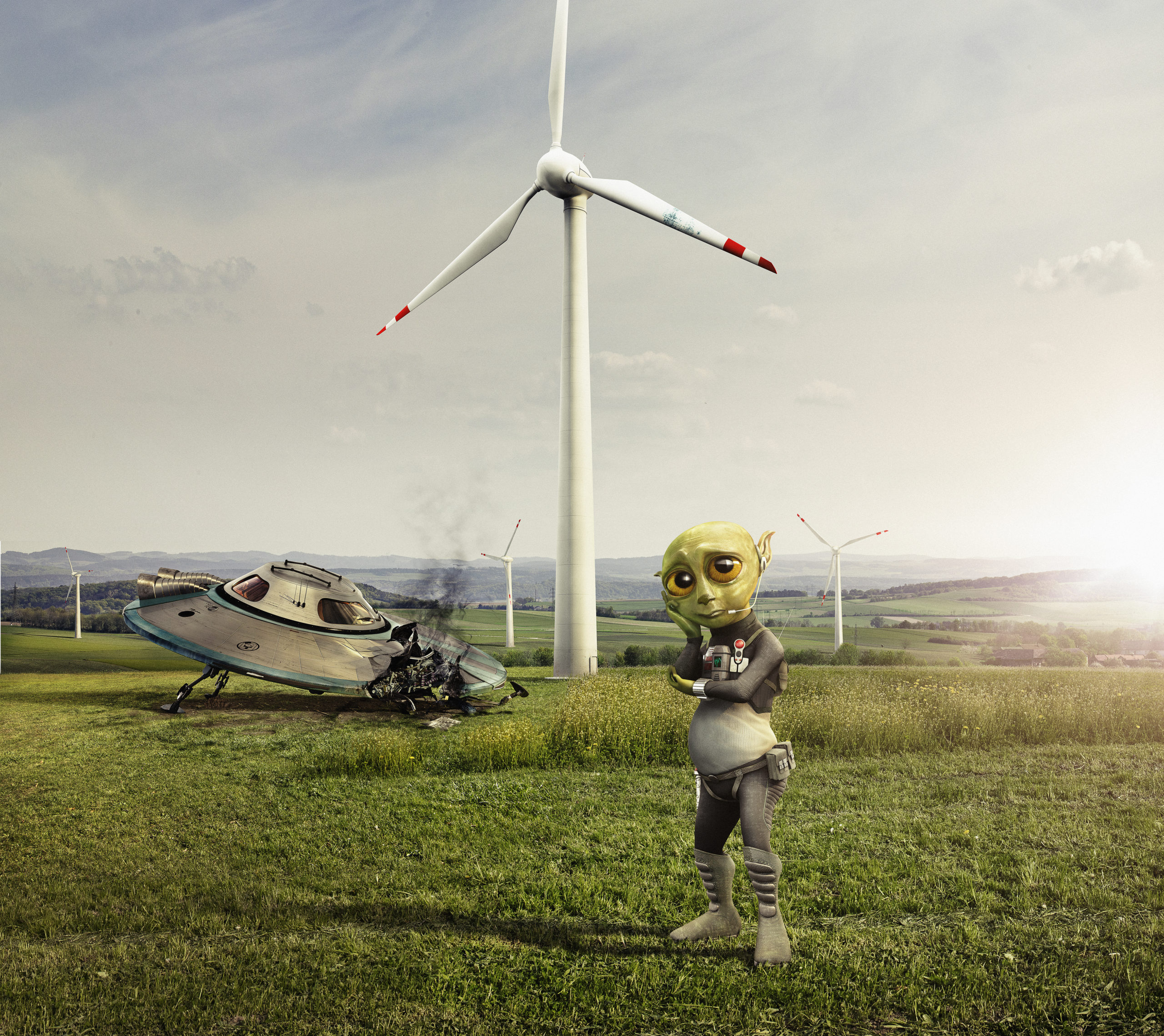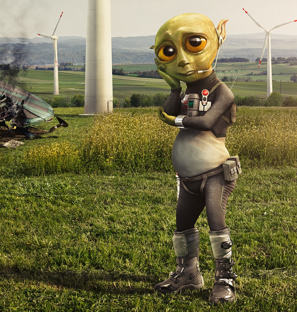 Wir wurden beauftragt, ein niedlich aussehendes Alien und dessen UFO für eine von Evoniks Printkampagnen zu entwerfen.